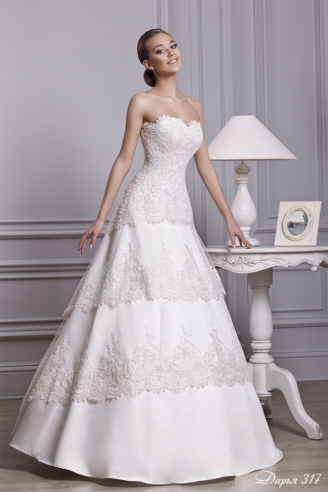 Купить в WhatsUpБелое открытое свадебное платье А-силуэта с покрытым кружевом лифом и широкими кружевными оборками на юбке.