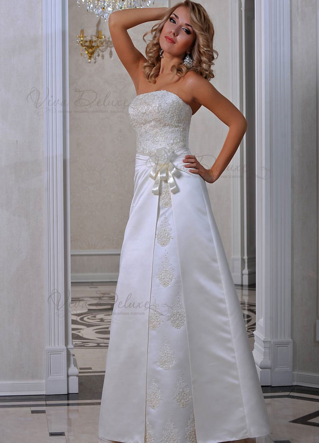 Купить в WhatsUpБелое атласное свадебное платье с кружевным лифом отделанное кружевом и лентами.