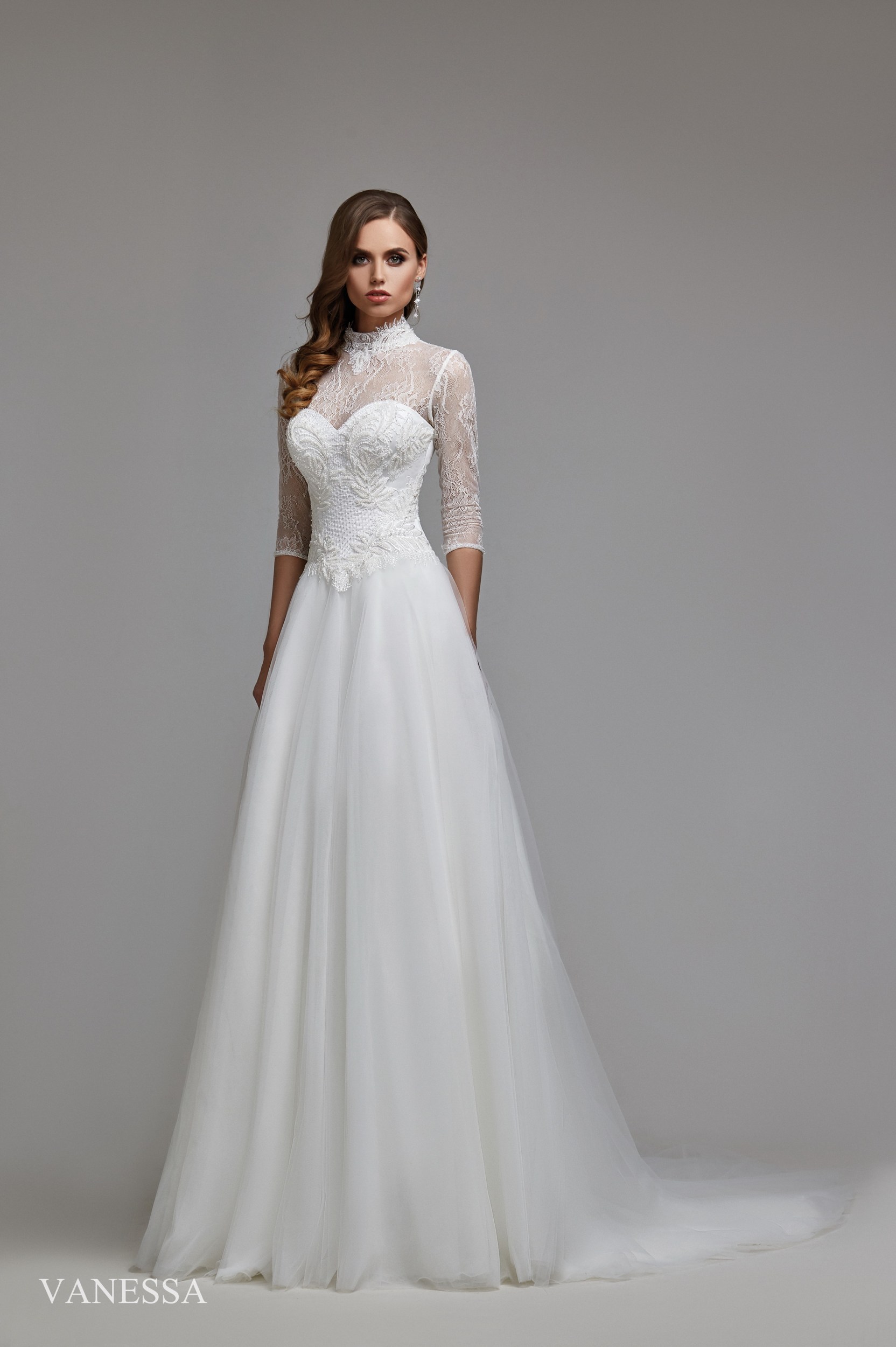 Длинные кружевные рукава, закрытые плечи, необлегающий фасон.