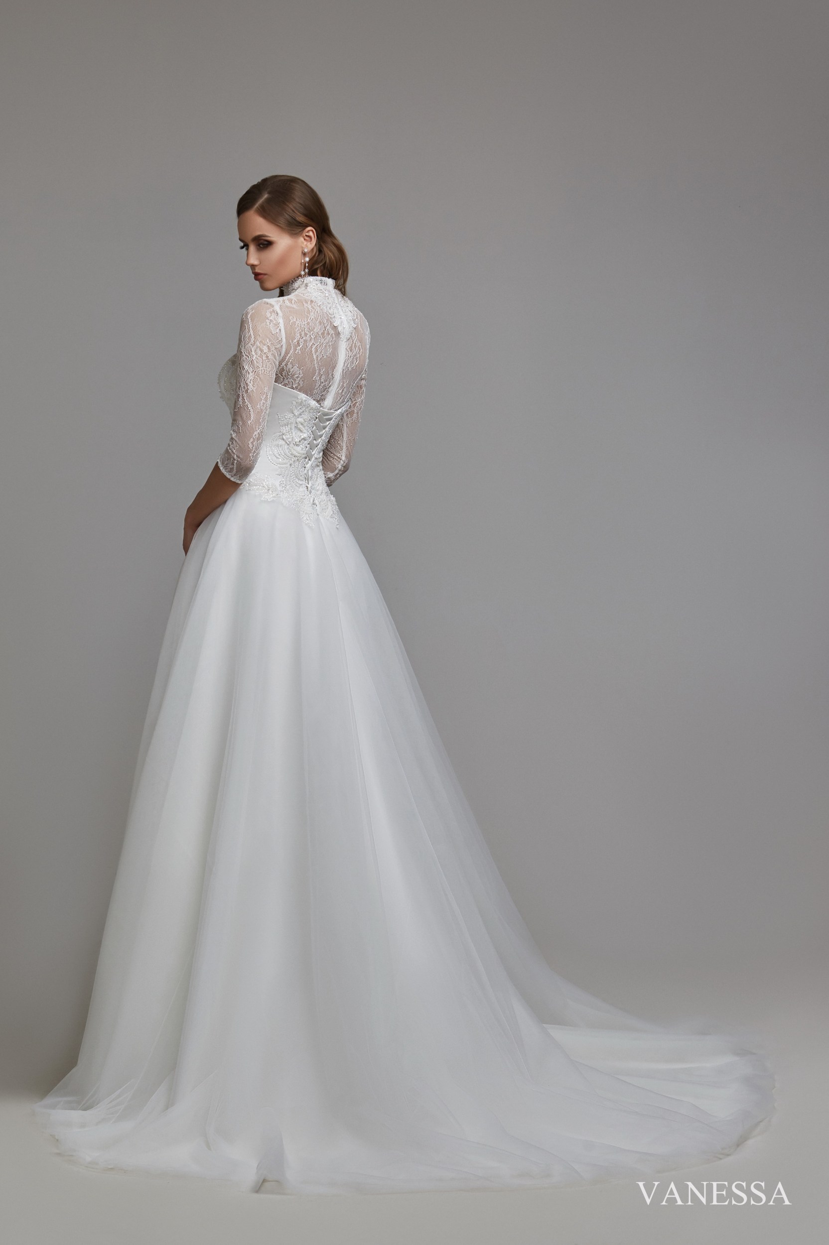 Платье для венчания белого цвета со шлейфом и кружевным лифом на пуговках.