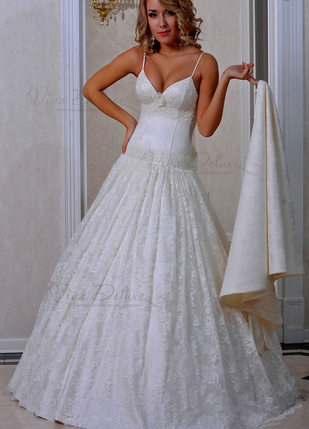 Купить в WhatsUpБелое кружевное свадебное платье А-силуэта на тонких лямках, с отделкой вышивкой.