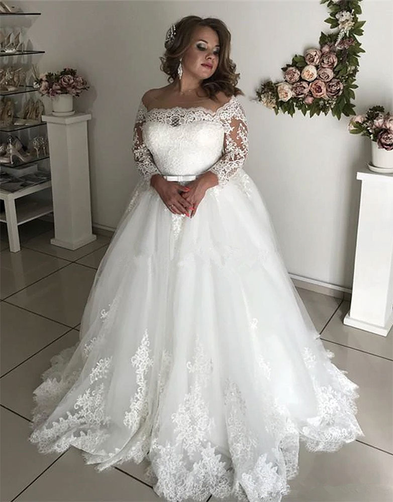 Пышное белое свадебное платье большого размера с кружевным лифом на пуговках и с длинными кружевными рукавами.
