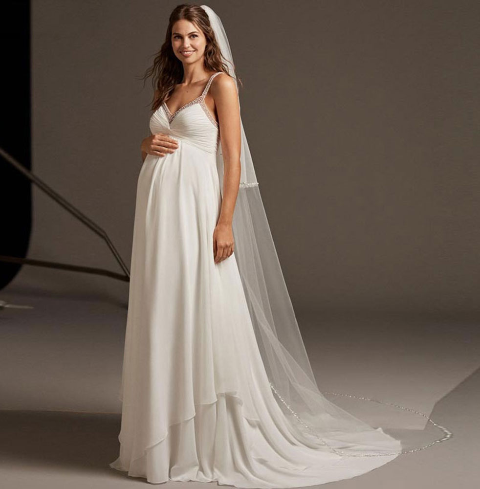 Купить в WhatsUpЛаконичное свадебное платье для беременных украшенное цветной вышивкой.