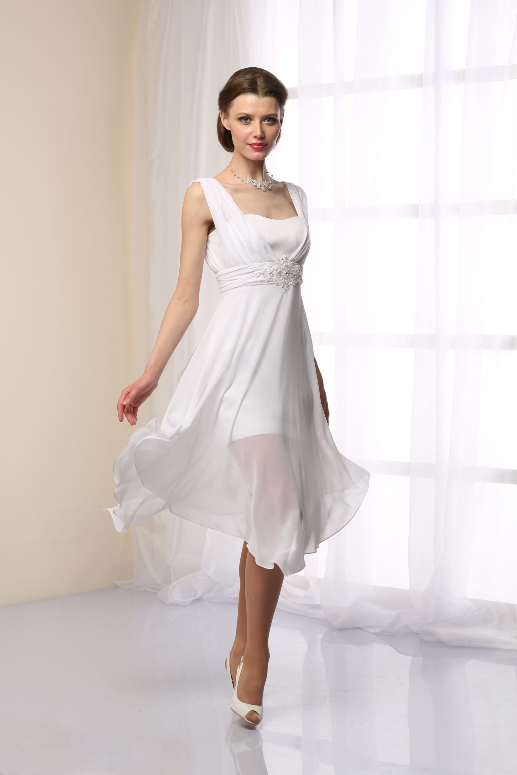 Свадебное платье миди, отделанное вышивкой. Широкие лямки с драпировкой.