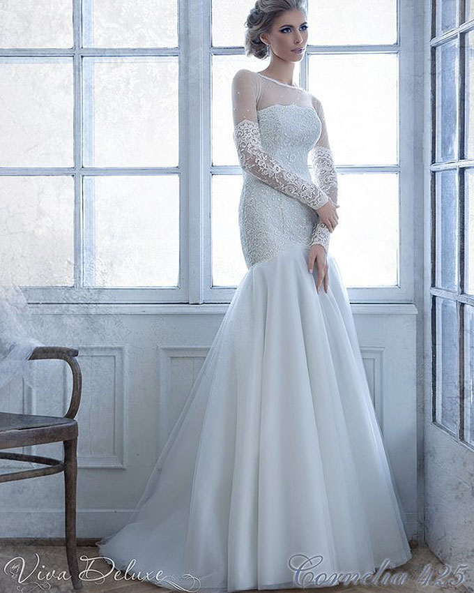 Купить в WhatsUpСвадебное платье русалка с полупрозрачным верхом лифа и кружевными рукавами