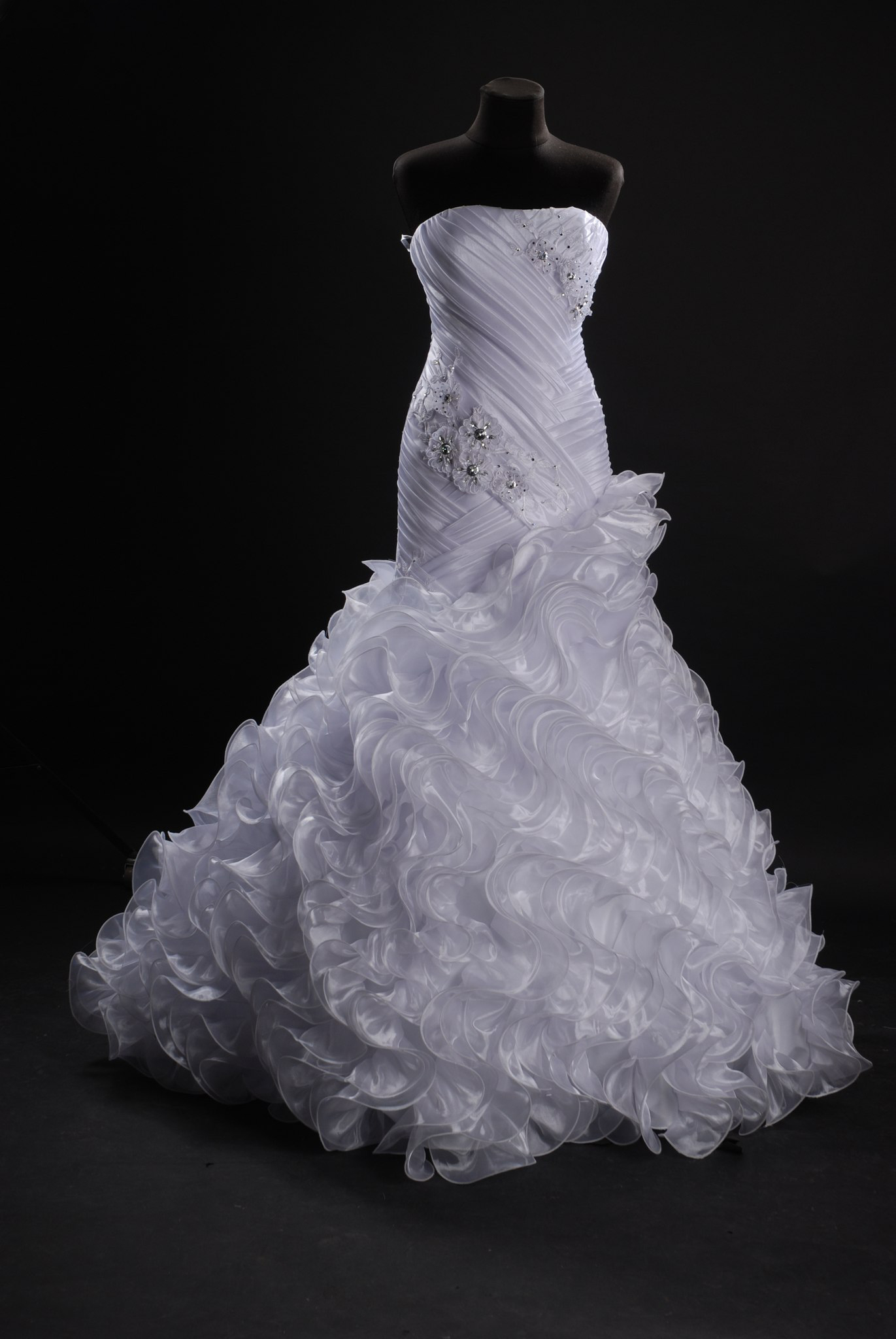 Украшено бантами и вышитыми стразами цветами. Элегантная драпировка лифа.