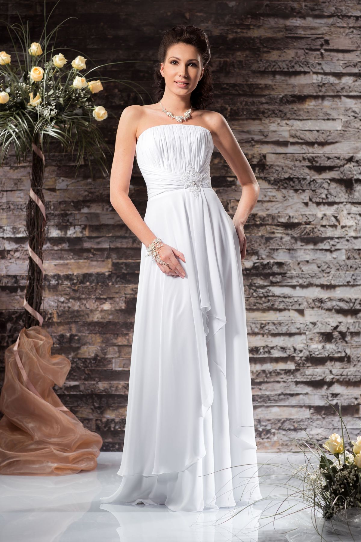 Купить в WhatsUpБелое свадебное платье в греческом стиле украшенное цветком на поясе и лаконичной вышивкой стразами.