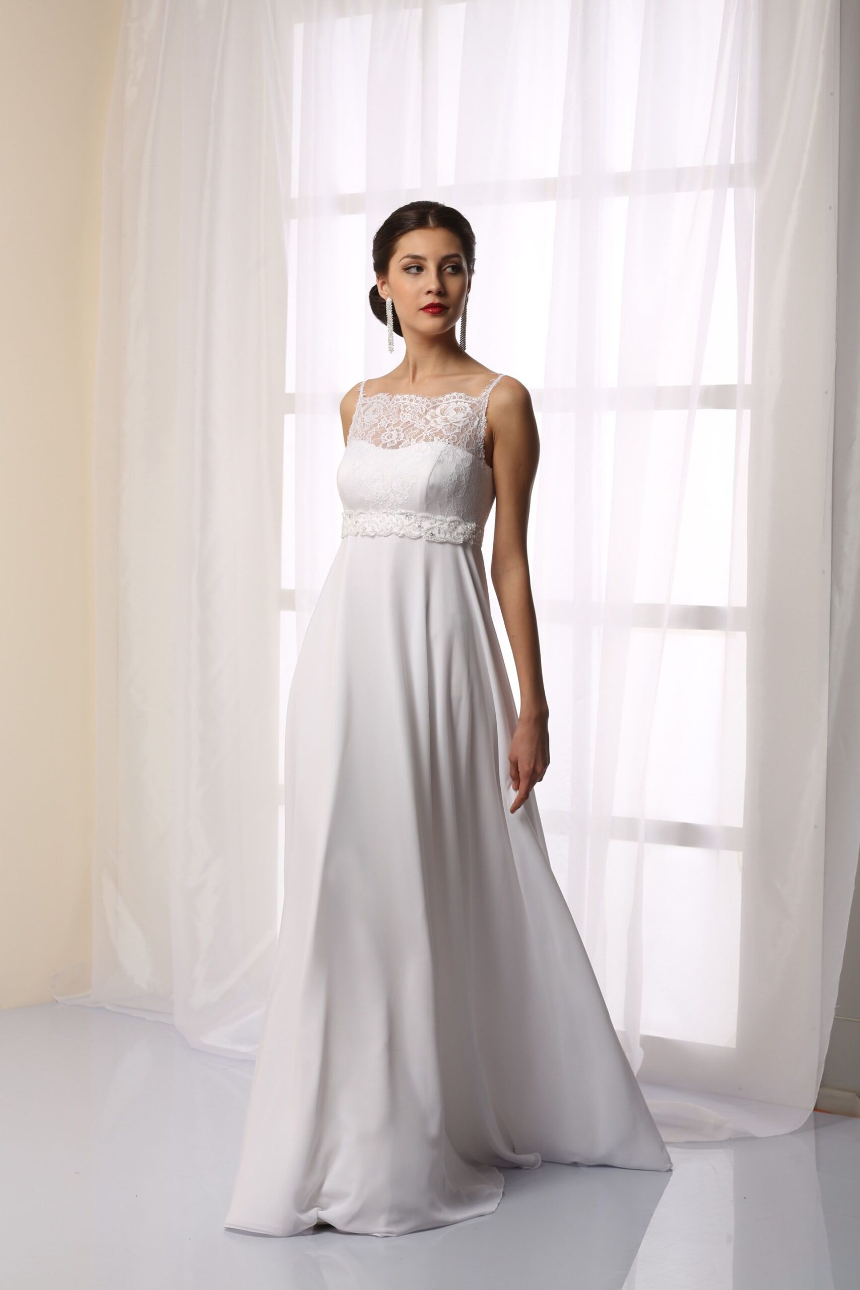Свадебное платье в греческом стиле белого цвета украшенное кружевом.